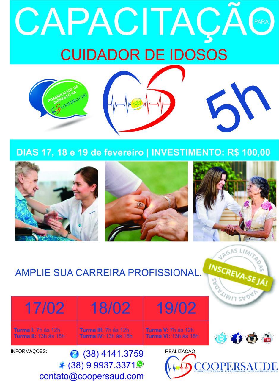 Curso de Capacitação de Cuidador de Idoso com professores esplecialistas e com grande experiência no mercado vagas limitadas garanta já a sua vaga pelo telefone 4141 37 59 ou se prefirir pelo nosso e-mail contato@coopersaud.com